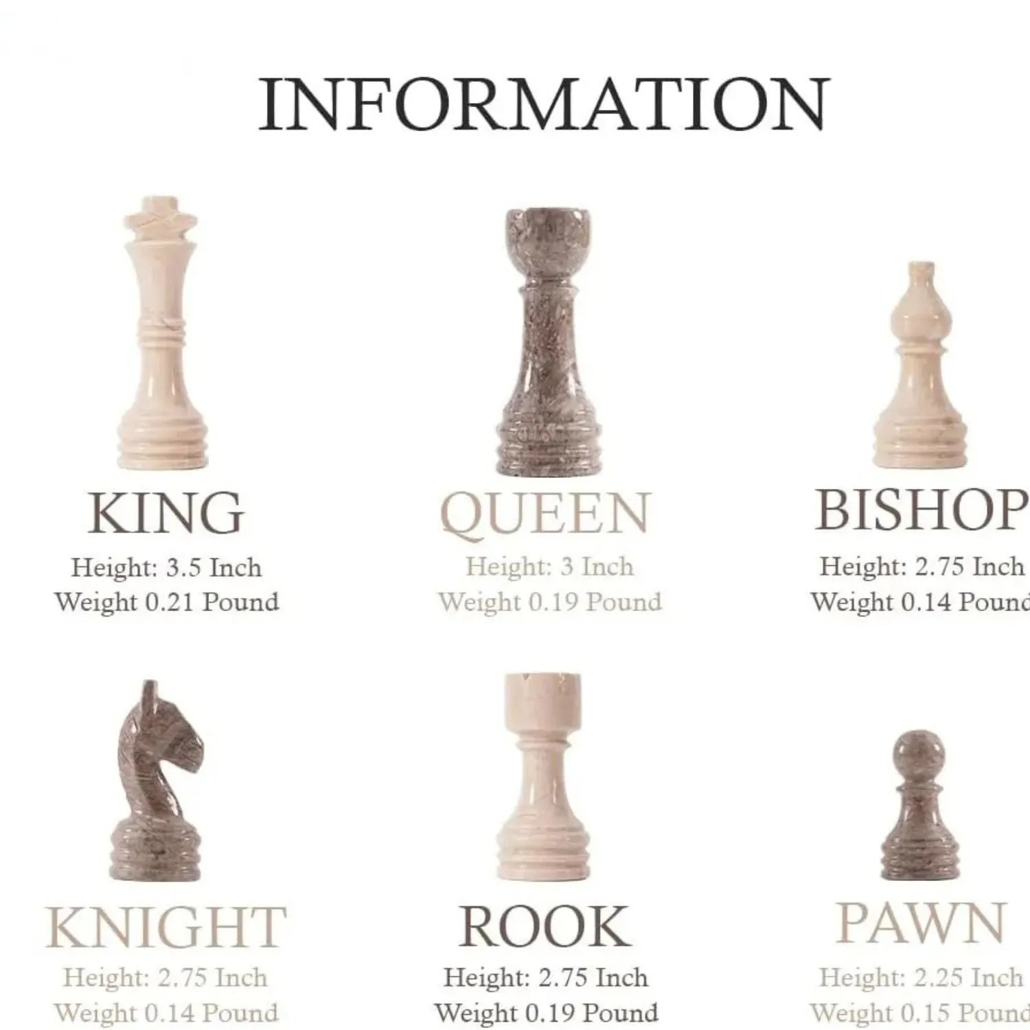 - SIZE - Board Size: 15 Inches. King Measures: 3.5 Inches. Queen: 3 Inches. Bishop: 2.75 Inches. Knight: 2.75 Inches. Rook: 2.75 Inches. Pawns: 2.25 Inches. The Chess Board Comes Along with an Attached Felt Bottom to Avoid Scratches. Separate Felt Bottoms Packet For All Chess Figures.