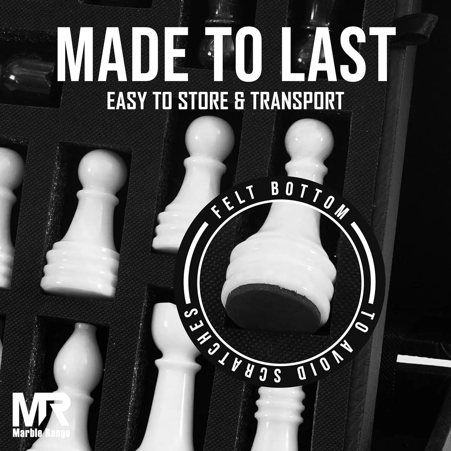 Marble Chess Set for Adults 15" Handmade White & Black Board Game with 32 Chess Pieces, 2 Extra Queens & Storage Box, Luxury Travel Game, Elegant Gift for Home Decor